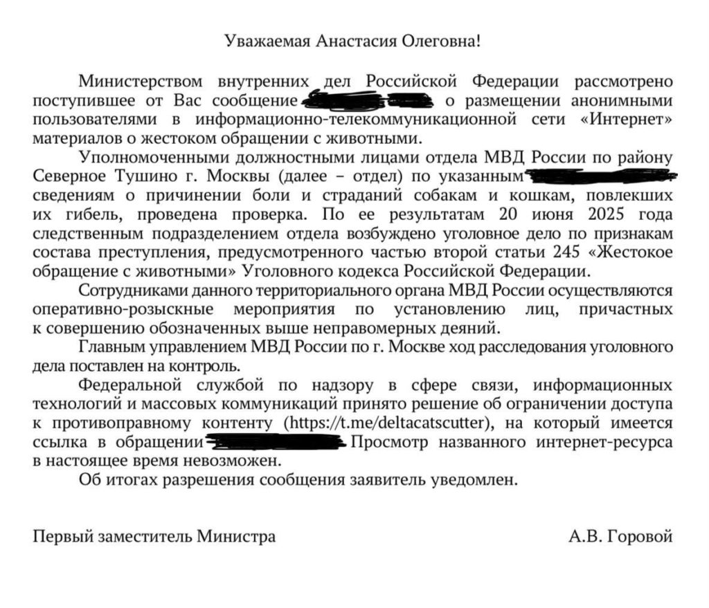 Согласно сообщению МВД, на основании направленных Анастасией Удальцовой сведений было возбуждено уголовное дело по статье о жестоком обращении с животными, а садистский Telegram-канал — заблокирован. Преступников разыскивает полиция.