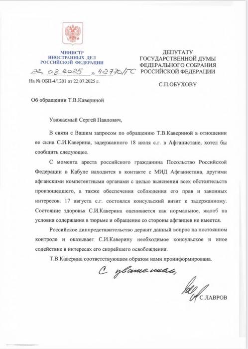 17 августа состоялся консульский визит к ученому-этнографу. Состояние здоровья С.И. Каверина оценивается как нормальное, жалоб на условия содержания и обращение со стороны афганской стороны не поступало.