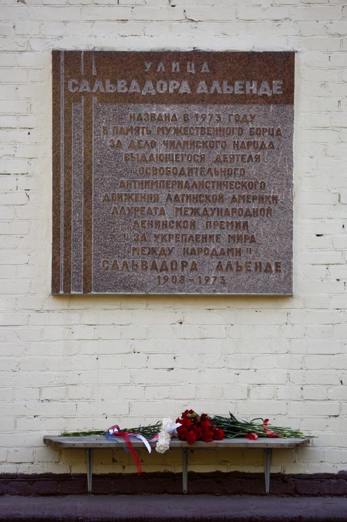 У мемориальной памятной доски, посвященной Президенту Чили Сальвадоре Альенде, чьим именем названа улица в московском районе «Сокол», собрались чилийцы, представители посольств латиноамериканских стран и других государств, московские коммунисты и комсомольцы, сотрудники столичной библиотеки имени Пабло Неруды, участники музыкального коллектива «Гренада», члены Интербригады МГК КПРФ.