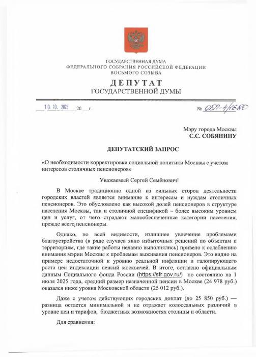 Депутат запросил у Правительства Москвы данные о динамике социальных расходов и эффективности адресной поддержки пожилых граждан за 2020–2025 годы.