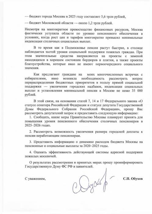 Депутат Государственной Думы от фракции КПРФ Сергей Обухов направил мэру столицы Сергею Собянину депутатский запрос о необходимости корректировки социальной политики Москвы с учётом интересов пенсионеров.