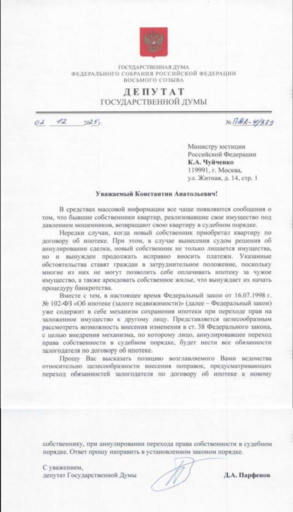 Направил официальное обращение Министру юстиции РФ К.А. Чуйченко с предложением обдумать изменения в закон «Об ипотеке» (№ 102-ФЗ). Если суд признает сделку недействительной и возвращает квартиру прежнему собственнику, то вместе с квадратными метрами к нему должны переходить и обязательства по ипотеке (обязанности залогодателя). Если квартира возвращается «пострадавшему продавцу», то пусть возвращается вместе с обременением. Не должно быть такого, что все преимущества остаются у одной стороны, а другая пребывает только с потерями. Ситуацию надо уравновесить.