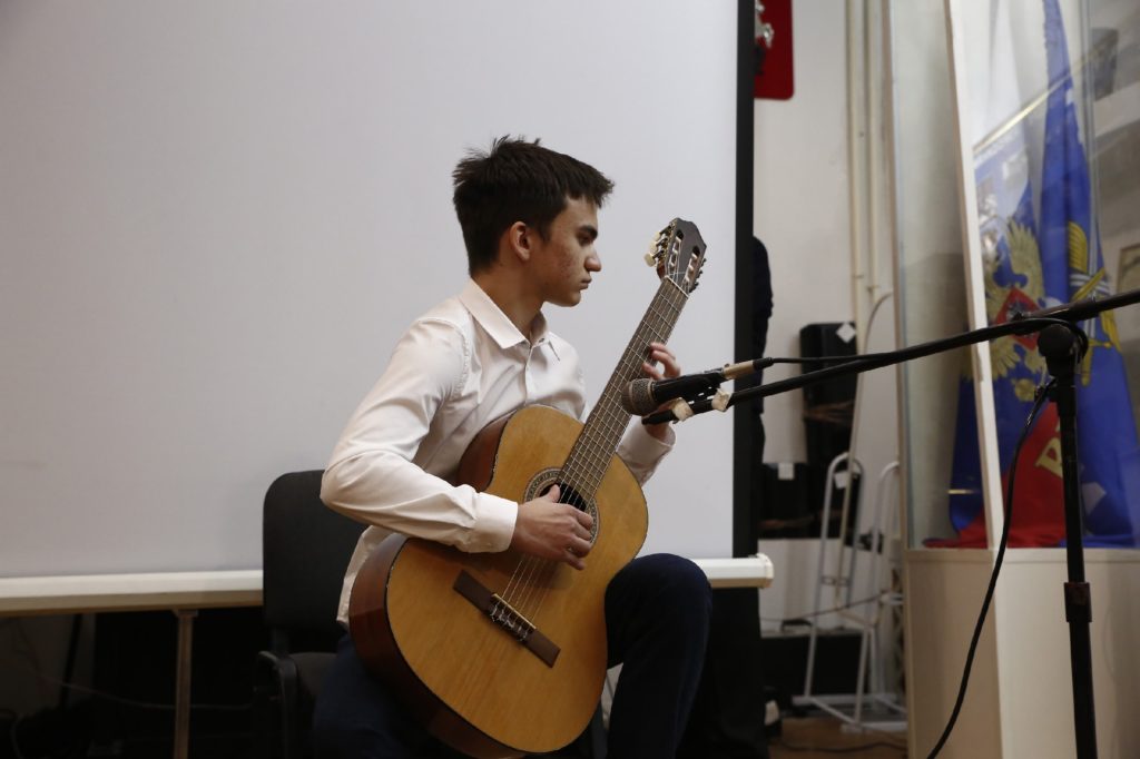 Начался концерт со вступительного слова ведущего и песни А. Беляева «Фидель» с показом кинокадров. Музыкант, гитарист и композитор Анатолий Беляев много лет руководит Студией патриотического искусства имени Бориса Гунько. Несколько слов о нем. Он родился в 1953 году в Воронеже, где и окончил Воронежское Государственное училище по классу гитары, в то же время начал писать стихи и песни. Он лауреат конкурса им. В. Высоцкого(1996 г.), лауреат Первого Всероссийского конкурса «Песни Сопротивления-97», дипломант Всероссийских конкурсов «Песни Сопротивления» (1998,1999, 2000,2002-2005), дипломант Всероссийского конкурса «Это Родина моя»; лауреат конкурса имени Александра Невского 2008 г. Беляев – автор более 300 песен. Все его песни о главном — о любви к нашей великой Родине. Дед Анатолия Беляева храбро сражался в годы Великой Отечественной. И об этом тоже мы можем узнать из песен барда. Послушаем песню «Чёртова гора», он написал её о своём дедушке. Всегда величественно и строго звучит песня о Красном Знамени Победы. Тяжело на сердце, стонет душа… Вот звучит песня «Мы не вышли», написанная на слова Анатолия Пшеничного. Эта песня — завещание нам от погибших в Доме Советов во время Черного Октября 1993 года. Так Анатолий обычно завершает ей свои концерты. И зрители вместе с автором гордятся своими отцами и дедами, подарившими нам Великую Победу.