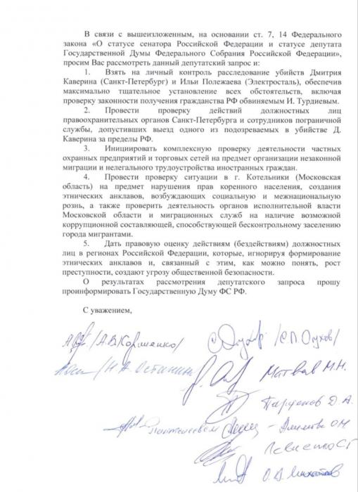18 января погиб 17-летний Илья Полежаев. Уроженец Таджикистана Имомали Турдиев, имеющий гражданство РФ, нанес подростку 17 ножевых ранений. Депутаты указывают на особый цинизм и жестокость преступления, требуя проверки законности получения обвиняемым российского паспорта.