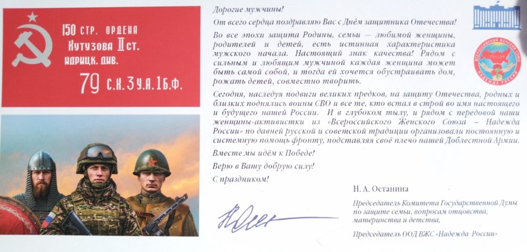 Хорошим подспорьем им служила поздравительная открытка от лидера ООД «Всероссийский Женский Союз – Надежда России», председателя Комитета Госдумы РФ по защите семьи, вопросам отцовства, материнства и детства Нины Останиной.