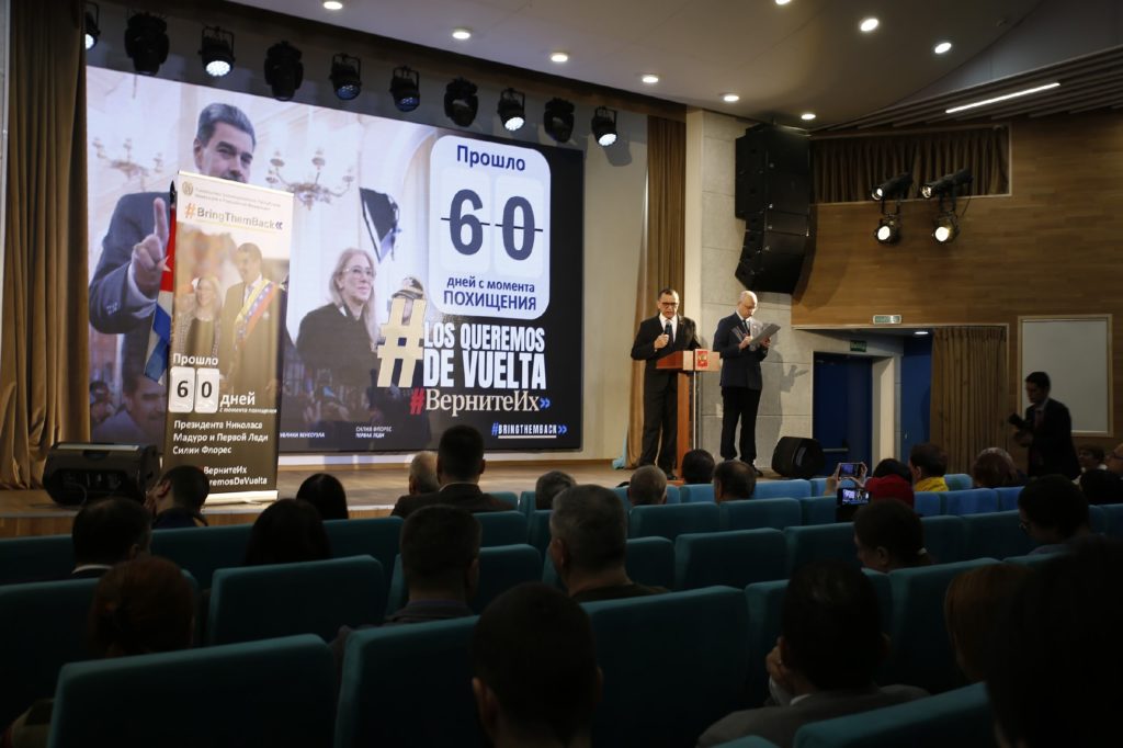 Посол Венесуэлы Хесус Рафаэль Саласар Веласкес сказал, что при похищении президента Николаса Мадуро погибло более 100 человек, в числе которых 32 кубинца. Борьба за освобождение президента Николаса Мадуро и Силии Флорес превратилась во всемирное дело. При их похищении было нарушено международное право, а также права главы государства. Люди от имени США говорят, что держат Венесуэлу в кулаке, что не соответствует истине. Венесуэла требует освобождения своего президента Николаса Мадуро и его супруги Силии Флорес. Организовано движение «Верните их!». У США нет причины удерживать президента Мадуро, у суда нет компетенции его судить. В завершение посол поблагодарил всех присутствующих за поддержку.