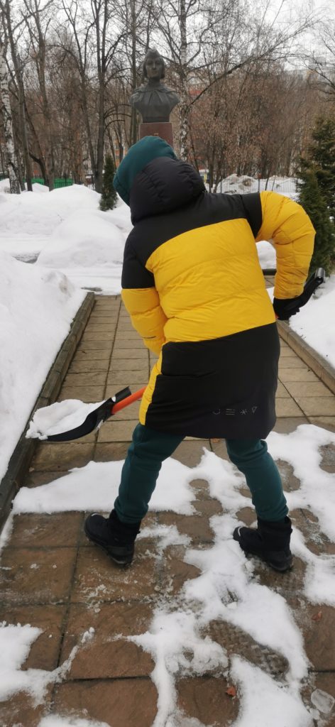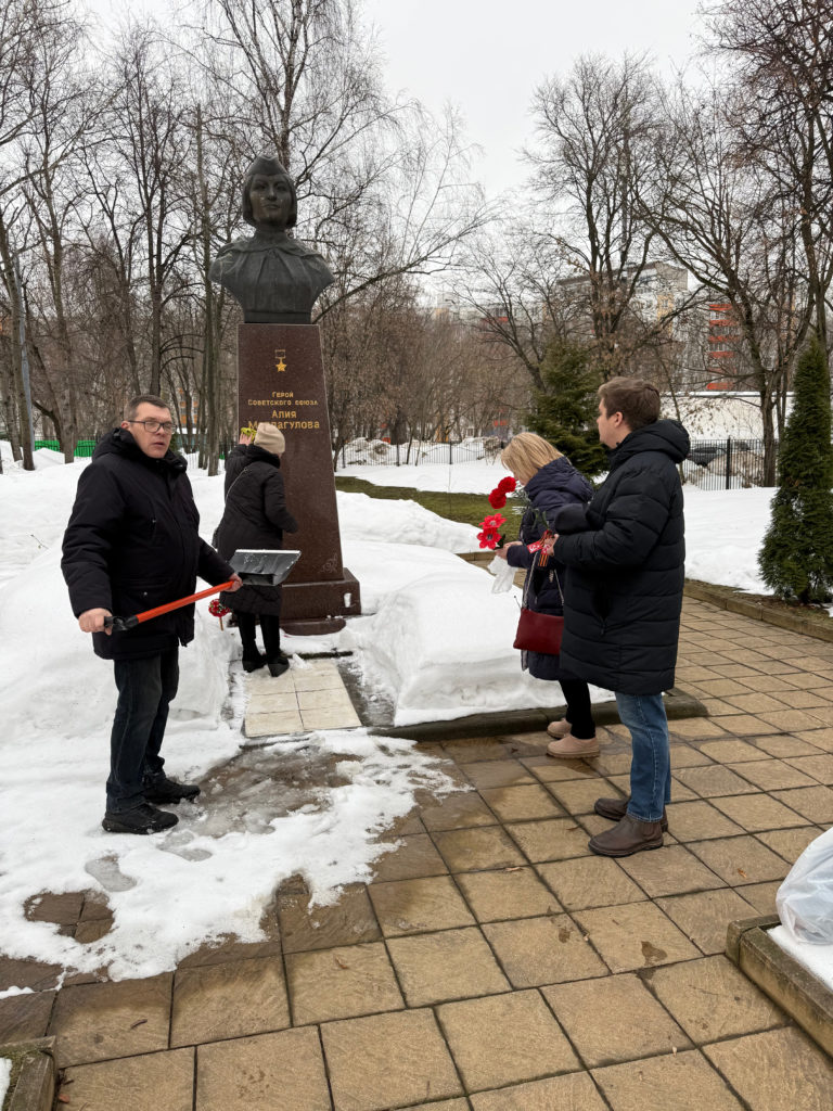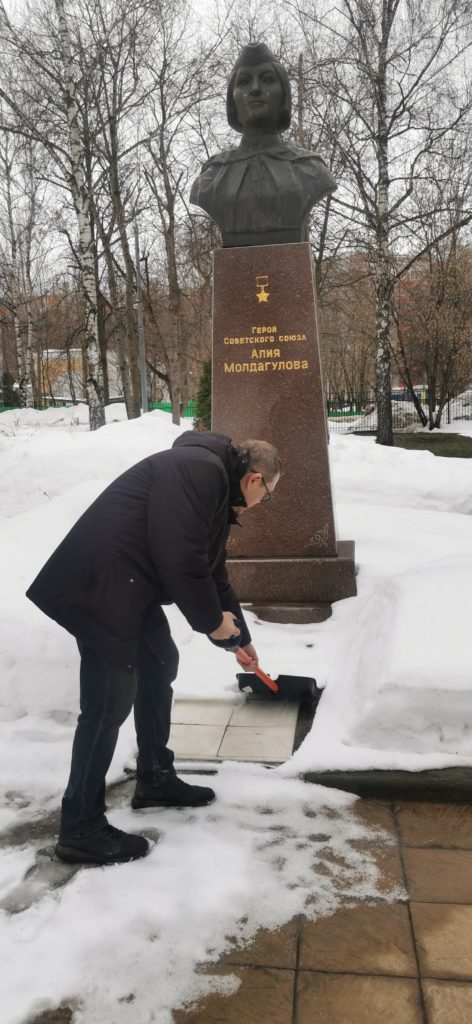 Также мы хотим выразить огромную благодарность рабочему, который убирается на территории школы — он впустил нас на территорию, и мы помогли убрать снег возле памятника, после чего возложили цветы. Сам он из Таджикистана, но также хорошо знает о подвиге Алии и чтит его. Когда он говорил с нами о ней, его глаза светились теплом.