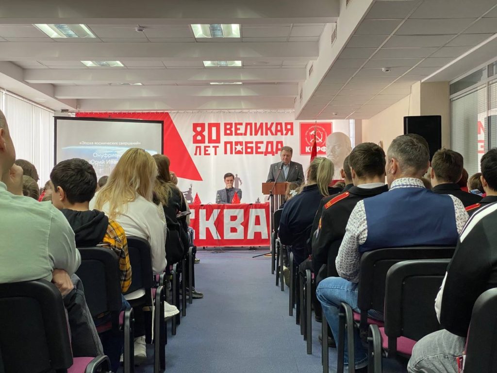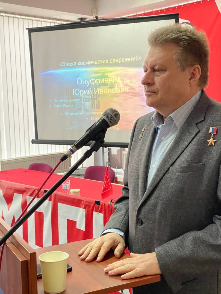В День Космонавтики, 12 апреля 2026 года, на базе МГК КПРФ юные члены пионерской организации встретились с летчиком-космонавтом Юрием Ивановичем Онуфриенко. На мероприятии присутствовал Второй Секретарь МГК КПРФ В.В. Обуховский.